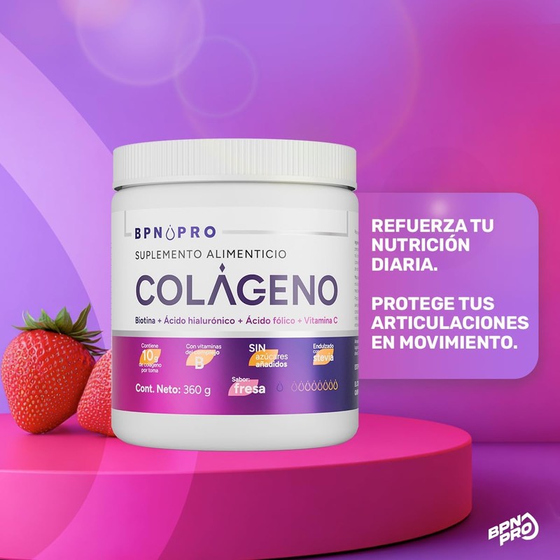 Colágeno Hidrolizado Puro en Polvo 360g - Fresa | Con Vitamina C, Vitamina D3, Zinc, Vitamina E, Ácido Fólico y Ácido Hialurónico | Vitaminas para el cabello Sin Gluten ni Aditivos | BPN PRO