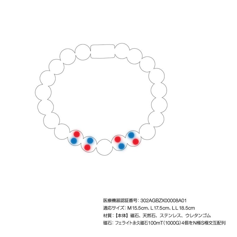 - Total of 4 100 mT magnets, alternating N poles S poles The magnetic force improves blood circulation and reduces stiffness. The loop is made of urethane rubber, so it is easy to put on and take off