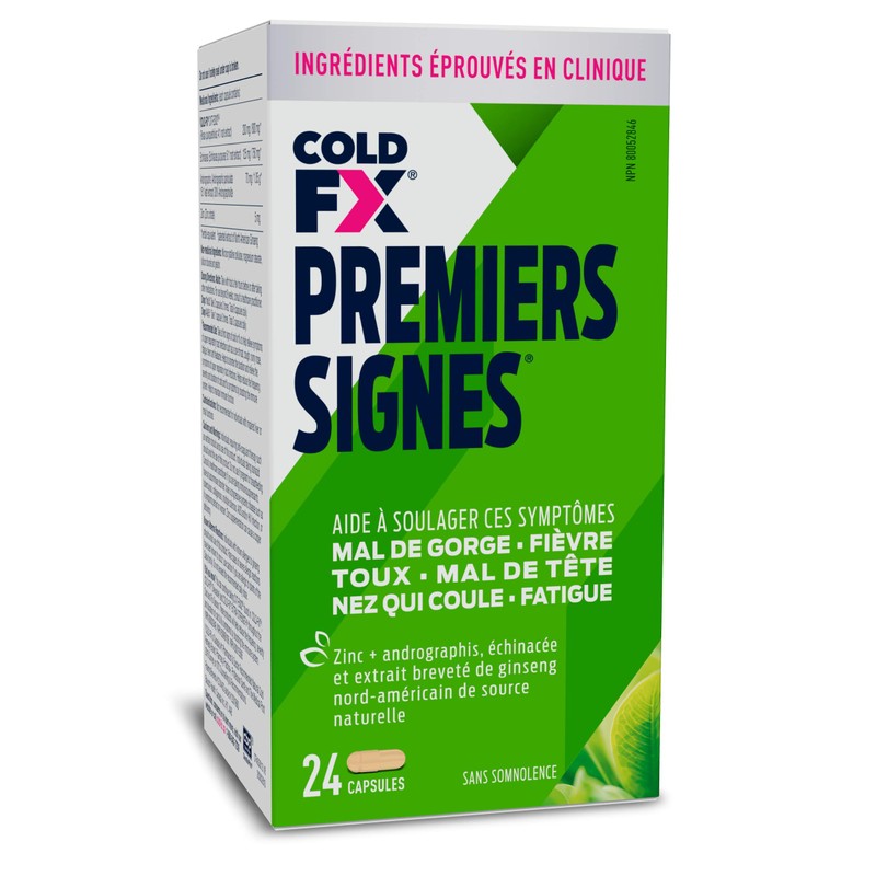 - MULTI-SYMPTOM RELIEF: COLD-FX FIRST SIGNS is a Natural Health Product that helps shorten the duration of upper respiratory tract infections; This non-drowsy formula helps relieve symptoms of sore throat, fever, cough, headache and runny nose