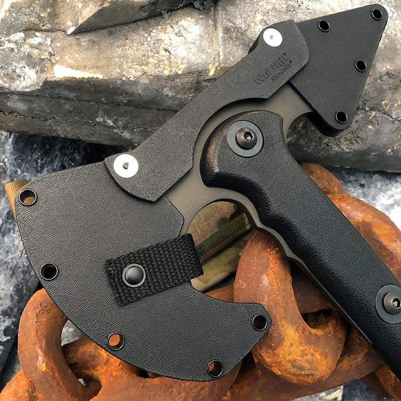 The Cold Steel Trench Hawk features a sharp cutting edge and wedge-style spike, offering numerous tactical “options” for our nation’s modern warriors. Drop forged from 1055 carbon steel and differentially hardened, the head of the Trench Hawk will withstand tremendous blows as well as the awful stress of prolonged hard use. The handle of our Trench Hawk is highly resistant to shock and will withstand abuse that would break even a tough hickory handle. And, as an added benefit, is easily and cheaply replaced when finally worn out from repeated throwing.* The Trench Hawk comes complete with a patented articulated Secure-Ex™ sheath. Additional Information: - WEIGHT - 29 oz. - PRIMARY EDGE -3 1/2” - HAWK LENGTH - 8 3/4” - HANDLE - Polypropylene - STEEL/MATERIAL - Drop Forged 1055 Carbon - OVERALL - 19