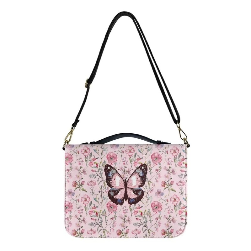 Coldinair Pink Butterfly Leather Bible Covers for Study Bibles Floral Carrying Book Case Church Bag Bible Protective with Strap and Handle for Standard and Large Size Bible