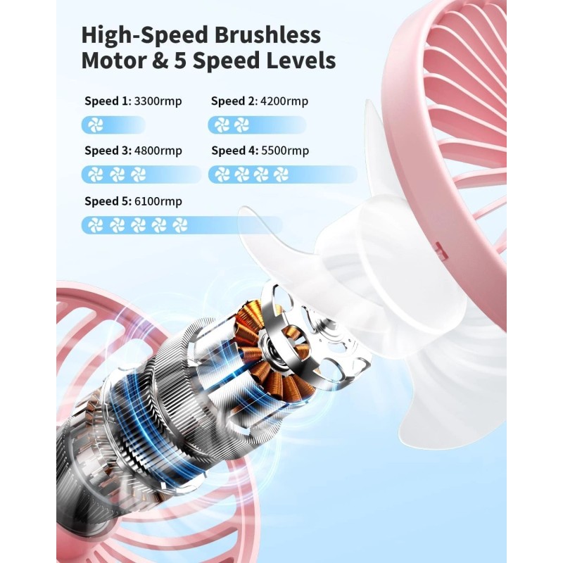 - 【Powerful Airflow & 5 Speeds】The small fan is equipped with a brushless motor, ensuring stable high-speed operation of the fan blades. The turbine-shaped blades concentrate and strengthen the airflow, continuously producing strong airflow that can cool you down within 3 seconds, making it your summer essential