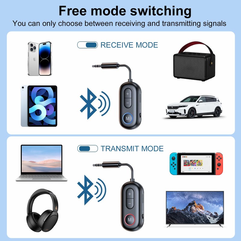 - Vielseitiger 2-in-1-Bluetooth-Sender und -Empfänger: Verbinden Sie im TX-Modus nicht-Bluetooth-fähige Geräte wie Fernseher oder PCs mit Bluetooth-Lautsprechern und -Kopfhörern, oder nutzen Sie im RX-Modus Ihren kabelgebundenen Lautsprecher oder Kopfhörer mit Ihrem Smartphone.