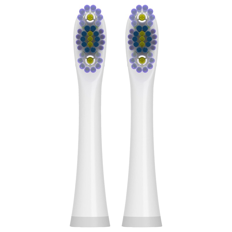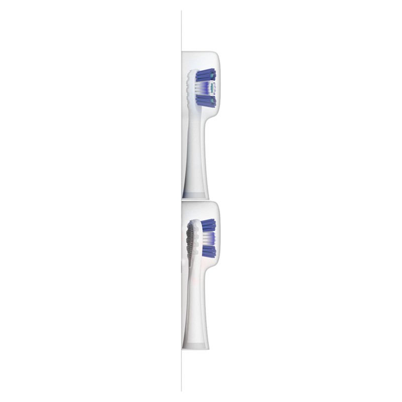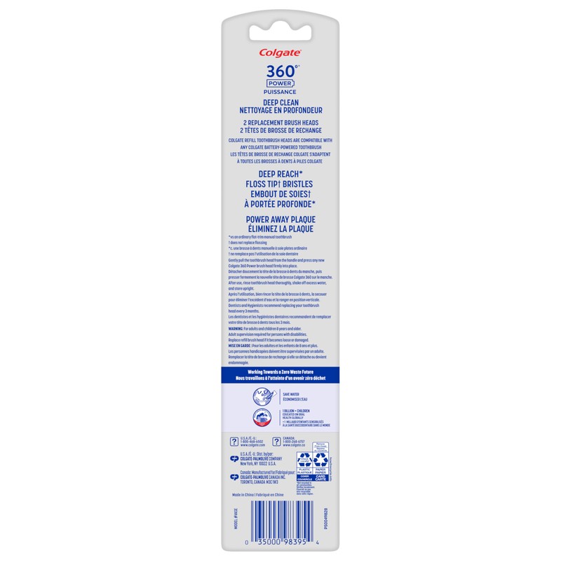 The Colgate 360 Floss Tip Sonic Refill Pack comes with two replaceable brush heads. The compact brush head includes Floss Tip† bristles and polishing cups to remove surface stains, and a cheek & tongue cleaner