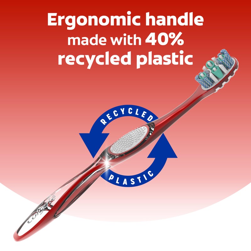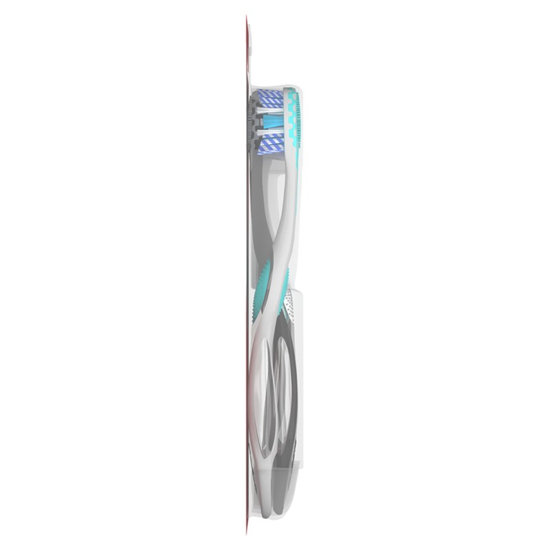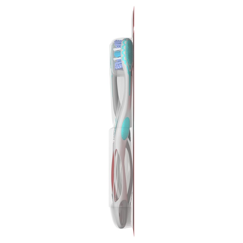 The Colgate 36? Optic White Advanced soft whitening manual toothbrush features an advanced multi-action bristle design (vs. an ordinary flat trim toothbrush) and an innovative cheek & tongue cleaner design to remove bacteria from teeth, tongue, cheeks, and gums. The toothbrush also features spiral polishing bristles that help to remove surface stains from teeth, for a naturally whiter smile. It also features an ergonomic handle so that it fits comfortably in your hand. Flexible finger grips help the toothbrush to stay in place; reducing slippage and allowing for more precise maneuvering as you brush your teeth. Available in both soft and medium bristles.