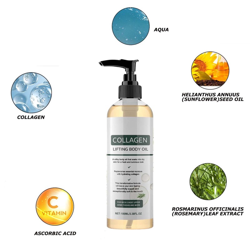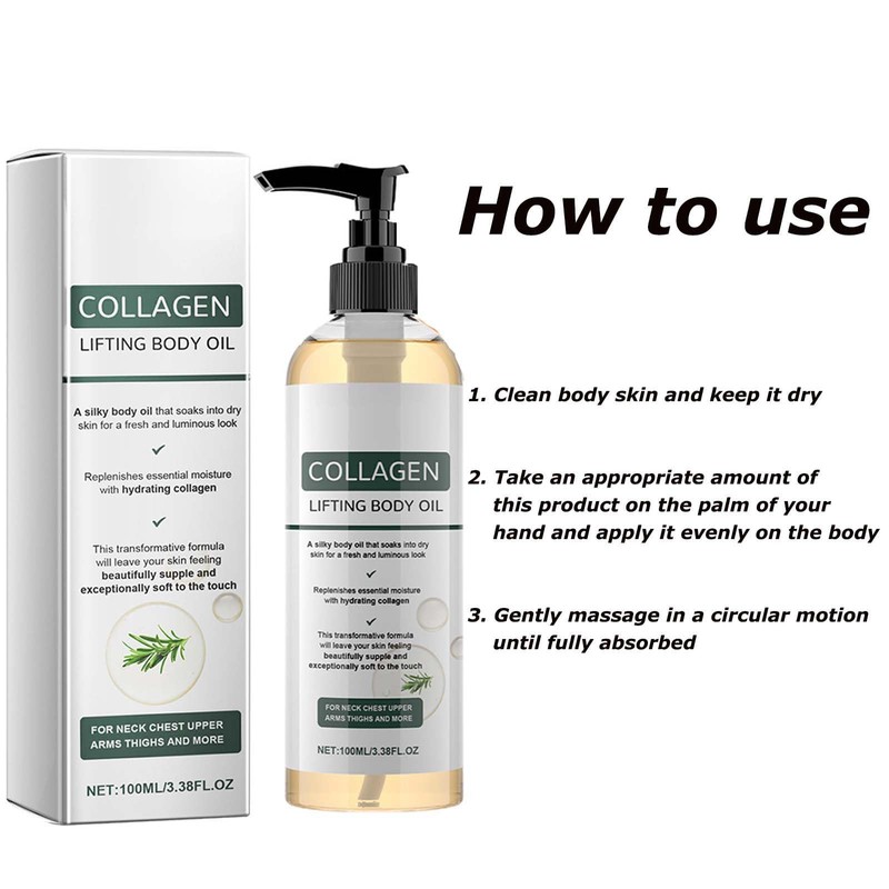 • 3【Tighten and Firm】Reduce wrinkles while effectively tightening your skin with our Collagen Lifting Body Oil. The rich collagen components penetrate skin to strengthen and tighten upper arms, thighs, neck, and more. This anti-cellulite, anti-wrinkle, and anti-stretch mark formula is excellent for dry skin.