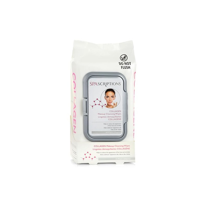 SpaScriptions Collagen makeup cleansing Wipes, reduce fine lines and wrinkles. Formulated with collagen to help rejuvenate your skin. Naturally moisturizing and give skin a radiant glow. Reveal healthier looking skin with these face cleansing Wipes. Specially formulated to remove dirt, oil, and skin impurities. Quick and easy to use, you can remove your makeup and cleanse your face in seconds.