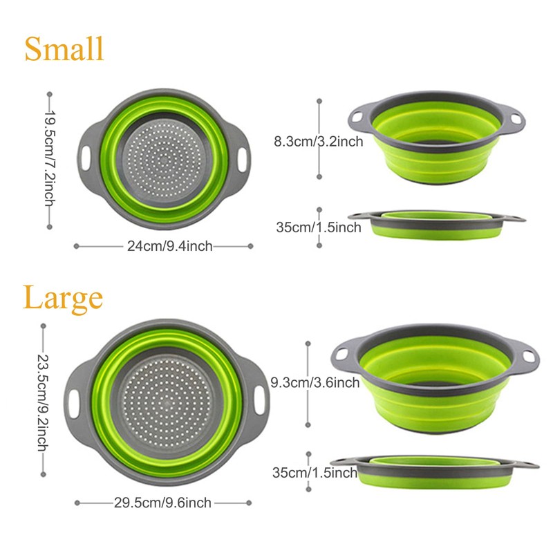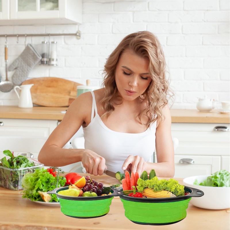 Collapsible Colander, Set of 2 Pcs Collapsible Strainer, Space-Saving Kitchen Strainer, Food-Grade Silicone Folding Strainer Colander with Handle, Green