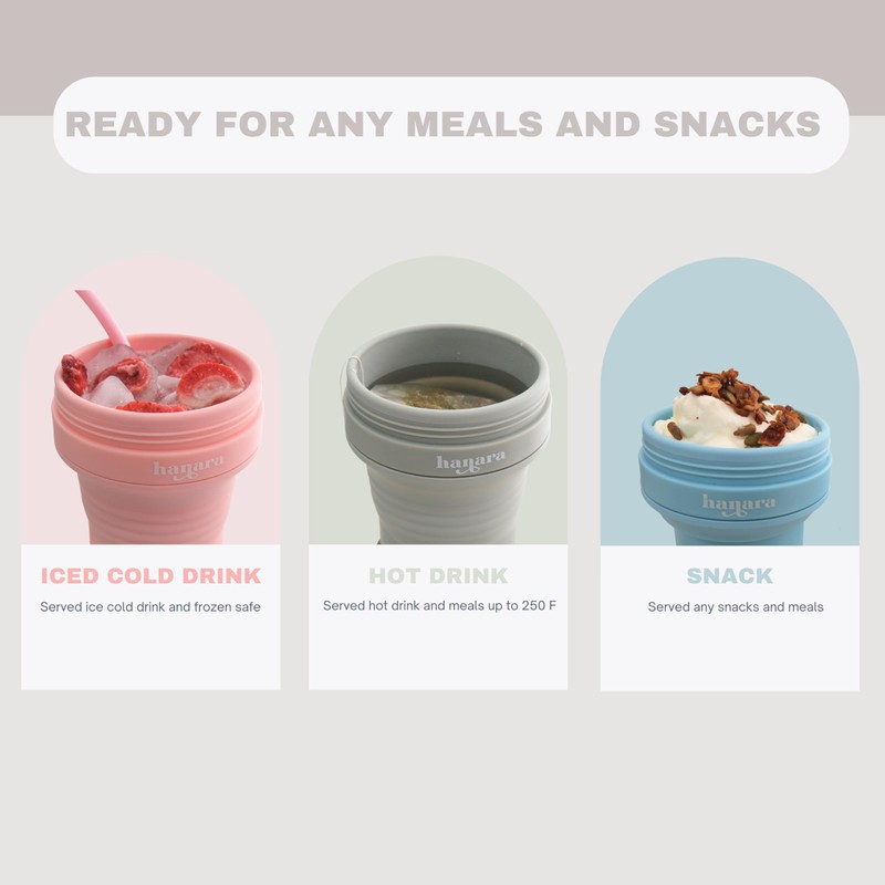 - REDUCE THE USES OF DISPOSABLE CUPS: Reduce single-use plastic with this reusable, compact travel cup that’s perfect for cutting down on disposable cups while staying stylish and eco-conscious. Take the step towards a greener, more convenient lifestyle and enjoy your drinks anywhere with the Hanara Collapsible Cup.