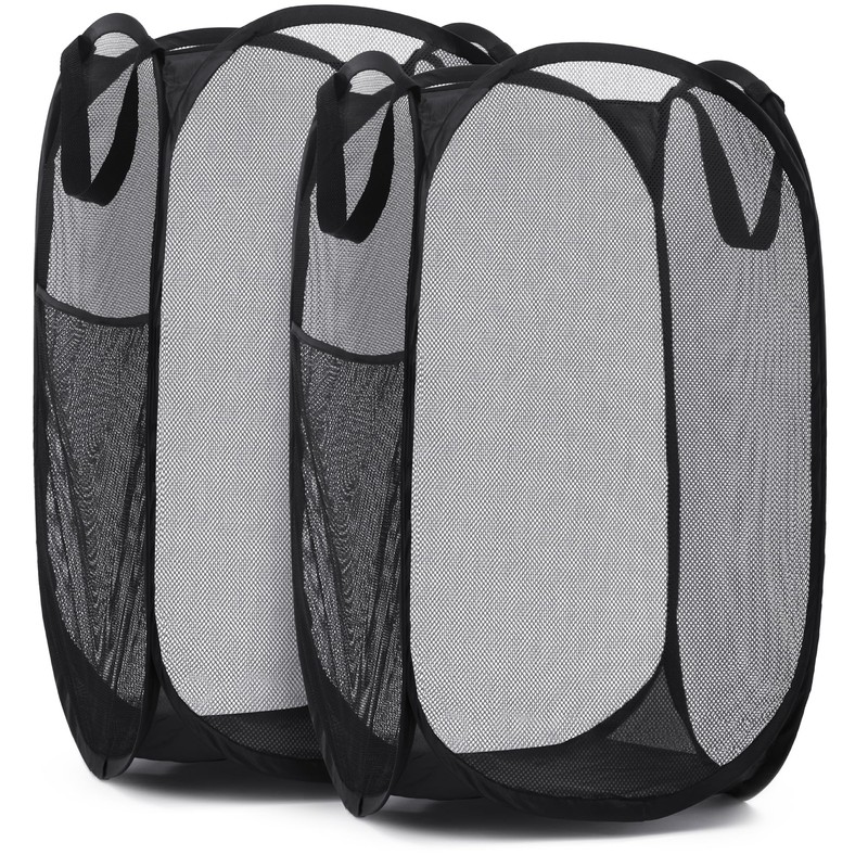 Handy Laundry Collapsible Mesh Pop Up Hamper with Wide Opening and Side Pocket - Breathable, Sturdy, Foldable, and Space-Saving Design for Clothes and Storage (Black | 2-Pack)