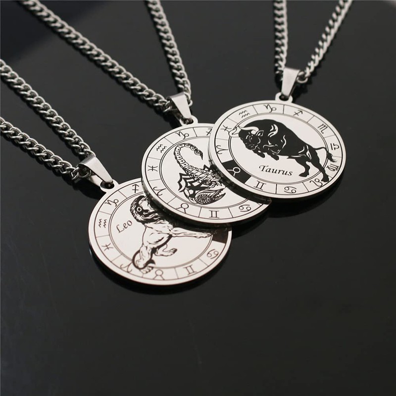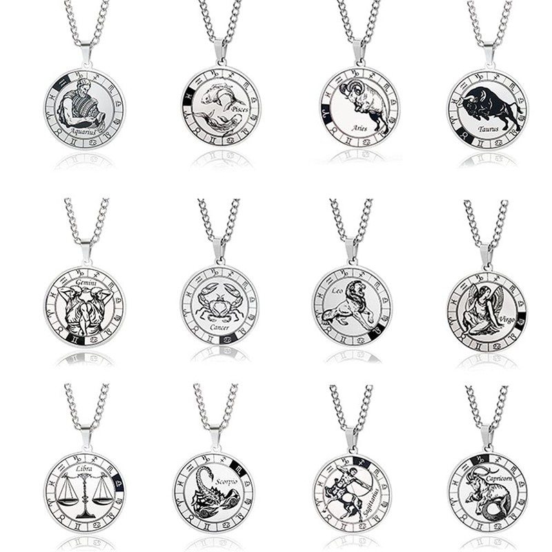 Collar con Cadena y Colgante de Constelación del Zodiaco de Acero Inoxidable con Disco Redondo y Signo del Zodiaco para Mujeres y Hombres, Regalo de Cumpleaños, Estrás