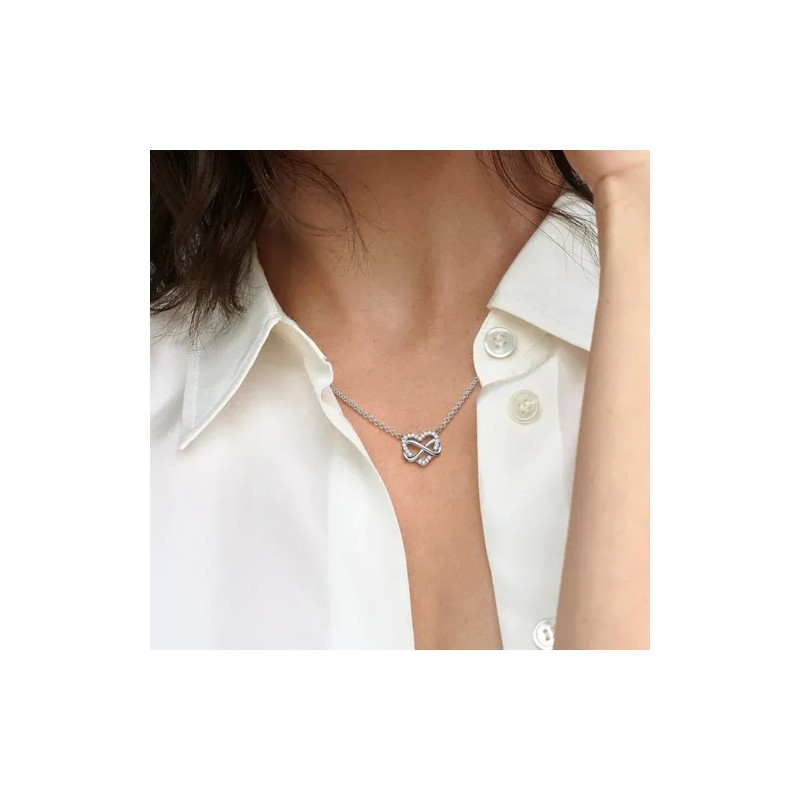Collar Corazón Infinito Brillante. Con un símbolo de infinito fijo y un colgante de corazón, esta joya en plata de ley. El corazón presenta un diseño calado con gemas brillantes a lo largo del borde y un símbolo asimétrico del infinito entrelazado alrededor del corazón.