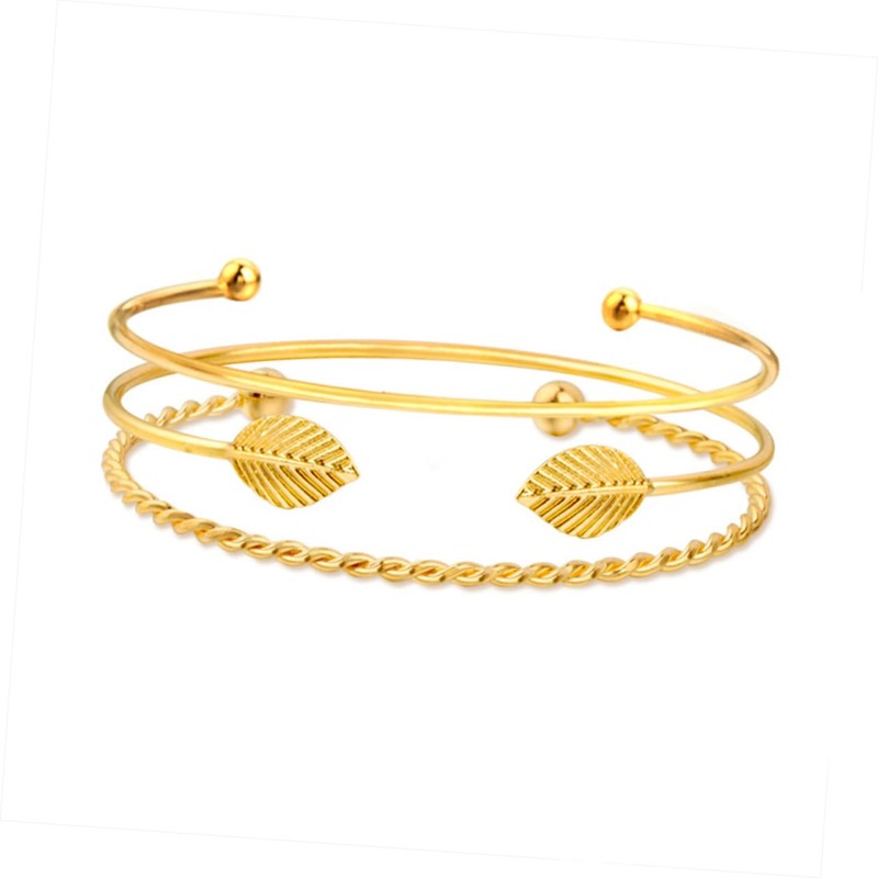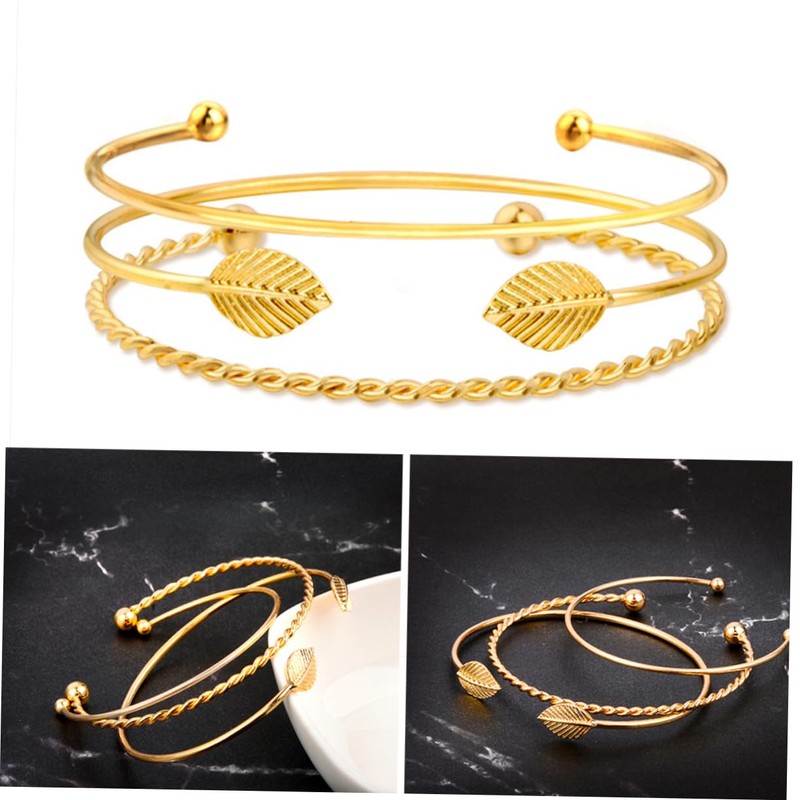 COLLBATH Gold Bracelet for Women 3pcs Multi-layer Leaf Opening Bangle Set Adjustable Cuff