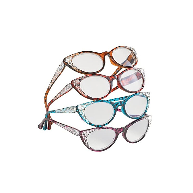 • This set of 4 colorful reading glasses features spring arms and precision-crafted lenses so you can see more clearly in style. The set includes 4 pairs of readers with a fashionable cat-eye design one each in red, blue, purple and brown tortoise-shell