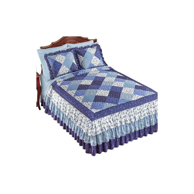 This lovely patchwork style quilted bedspread has a lovely collection of floral patches on the top in shades of blue and white with three tiers of ruffles in coordinating patterns along the sides. Matching shams sold separately. Machine wash. Polyester; imported. Choose: Full (89" x 59"), Queen (97" x 60") or King (97" x 78").