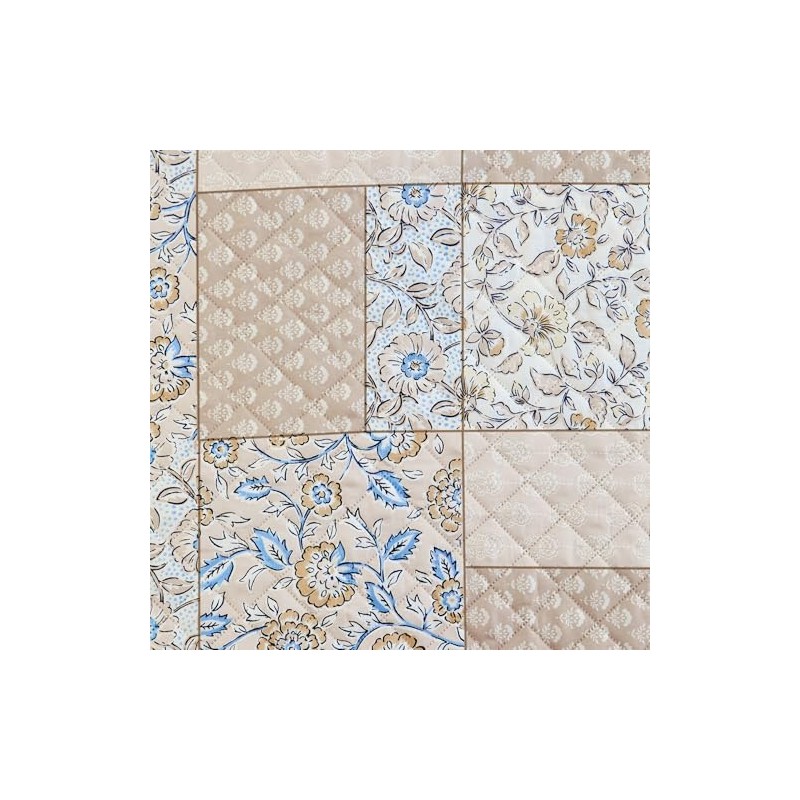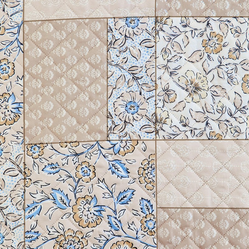 - The quilted cover has a charming floral patchwork pattern in neutral tones to coordinate with any home décor