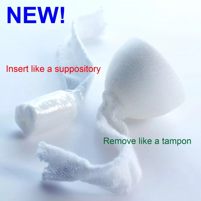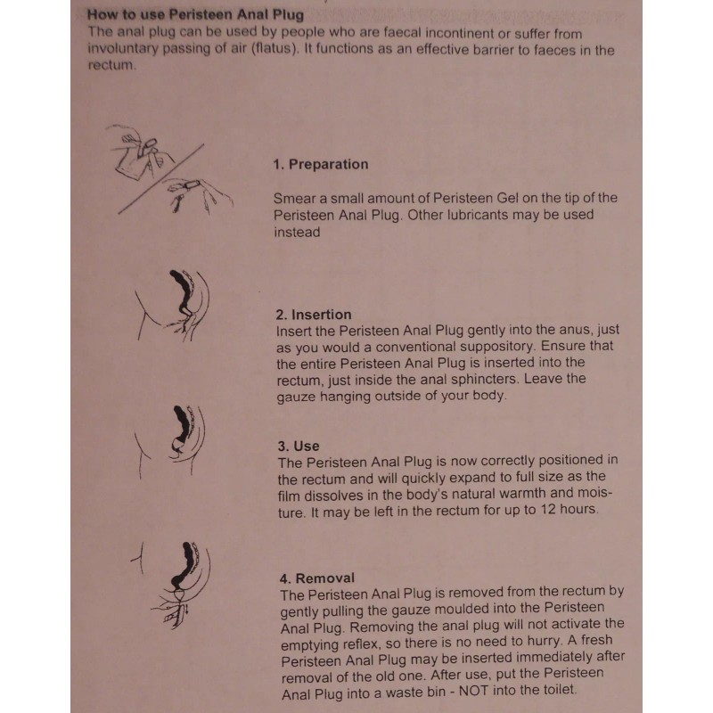 The anal plug is inserted just like a suppository. The foam has been compressed to a small size and coated with a water-soluble film. When the film is exposed to the warmth and moisture of the rectum, it dissolves leaving no residue and the plug then expands to 3 to 4 times in size (from approx. 13mm to about 45mm) once inside the rectum conforming to the shape of the rectal cavity and protecting against leakage.