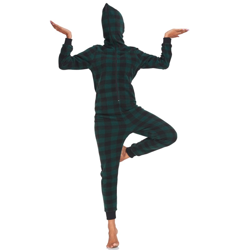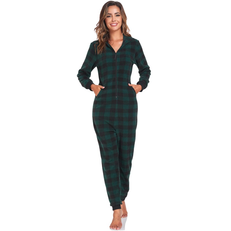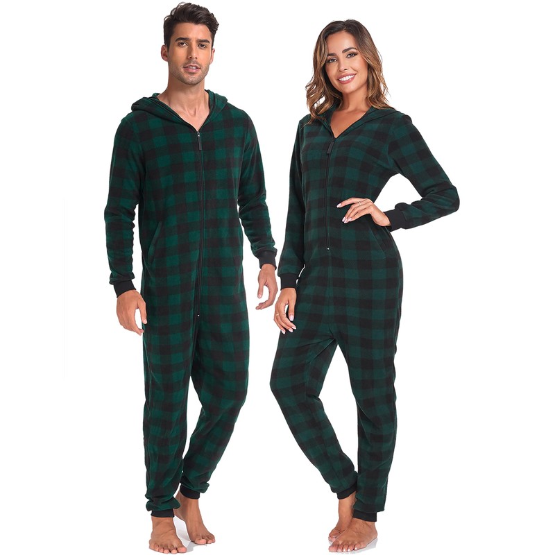 COLORFULLEAF Couples Christmas Pajamas for Family Hoodie Plaid Fleece Onesie Full Zipper Jumpsuits Green (Womens, M)