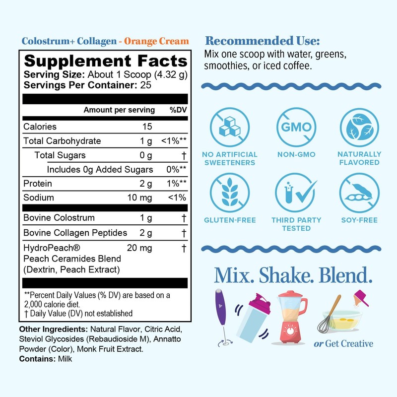Colostrum Collagen Powder Hydrolyzed Peptide HydroPeach Gut Health Skin & Immune Support | 1g Bovine Colostrum, 2g Collagen Peptides, 20mg Peach Ceramides | Orange Cream Flavored 25 Servings, No Sugar