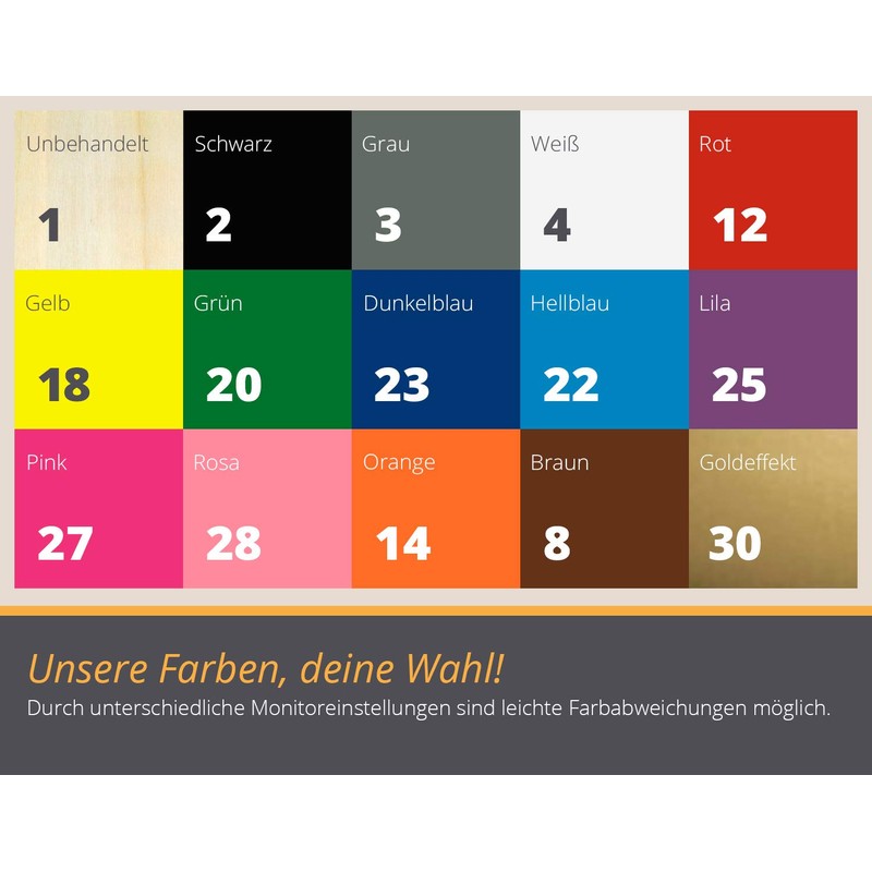 - Optional wood colours: untreated wood - white - black - grey - brown - purple - magenta pink - orange - red - yellow - blue - green - light blue - gold - pink