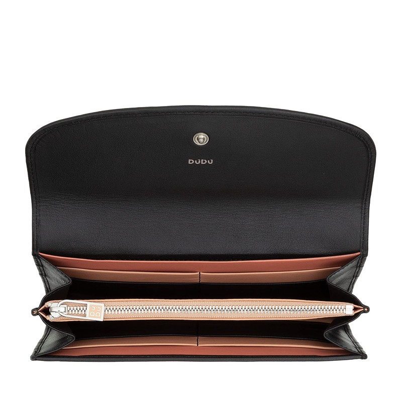 • Brand: DuDu Material: Full-grain Nappa calf leather Dimensions (closed): 19 x 10.3 x 2.5 cm Weight: 210 g Packaging: Yes Design: Ladies Features: 1 outer pocket, 9 credit card slots, 1 coin pocket with zip and 1 extra pocket. Available colours: Black, Pastel Blue, Raspberry Multicolor