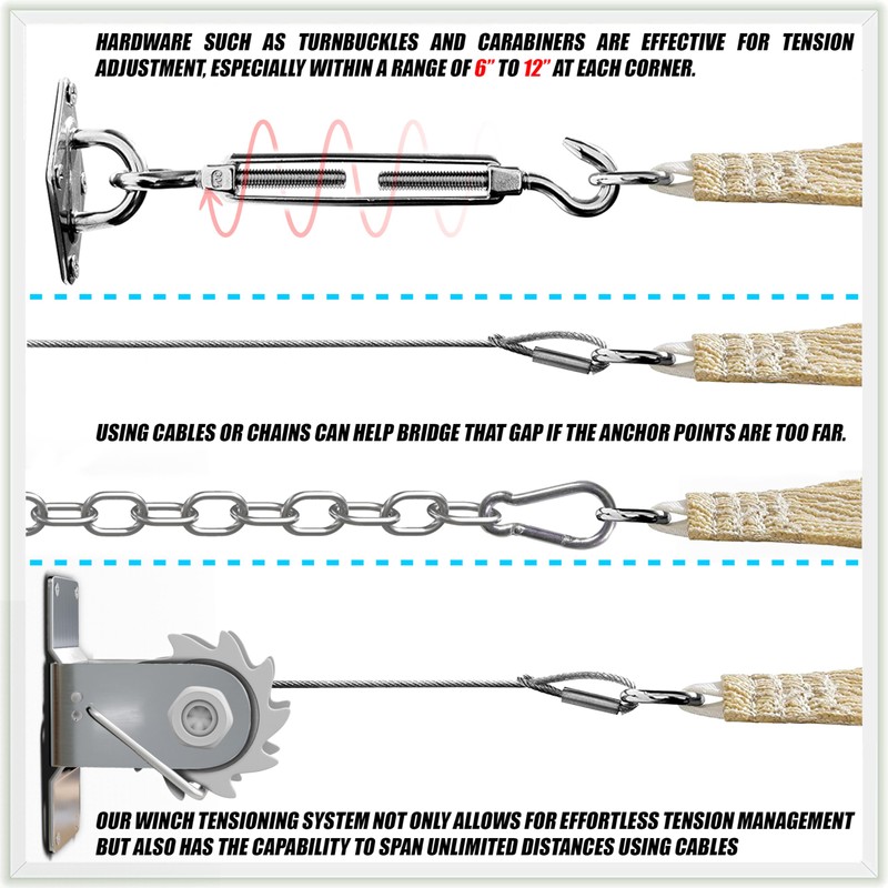 • ★【INSTALLATION GUIDE】: Installation hardware kits are required and sold separately, each D-ring will require one cable rope (DO NOT use nylon ropes, they break easily!!). Connect the other ends of cables to existing poles, trees or wall with shade sail hardware kits, high quality ColourTree hardware kits and cables are strongly recommended for best performance and appearance.