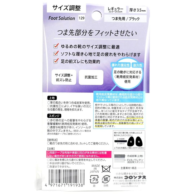 Columbus Pumps / Mule Size Adjustment Pad, Front Slip Prevention, Toe Half Cushion Effect, Regular Black