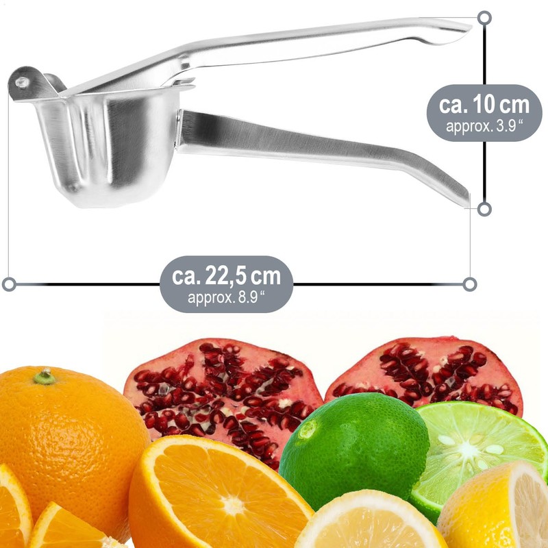 - Box contents: 1 x citrus hand press. Dimensions: press approx. 22.5 x 12 x 10 cm, filling basket approx. 7 x 9 x 5 cm (length x width x height). Colour: silver. Material: stainless steel 304. Dishwasher-safe