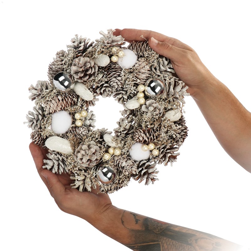 - Box contents: 1 x Advent wreath. Dimensions: approx. 30 x 9 cm (diameter x height). Material: polystyrene, cones (pine, spruce), twigs with flowers, wood, plastic, metal, yarn. Colour: white, brown, cream, silver