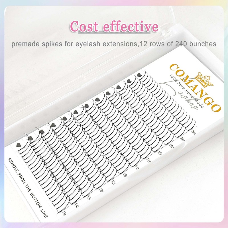 - 【Eyelash Specifications】:CoMango spikes lash extensions made from high-quality synthetic fibers, these spikes lashes hold their shape and can be reused multiple times with proper care.Tray a total of 12 rows and each row is 20 for a total of 240 lashes fans.