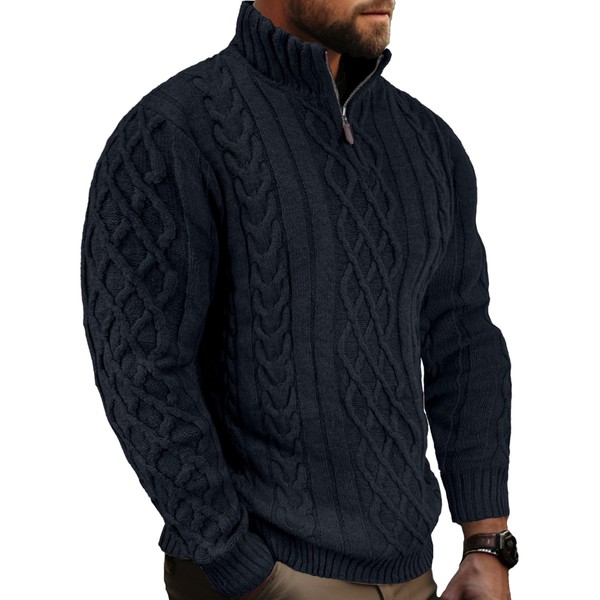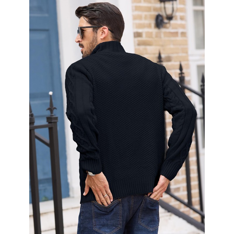Comdecevis Mens Pullover Sweater Cable Knit Sweatshirt Mock Neck Polo Soft Casual Quarter Zip Sweater L Black