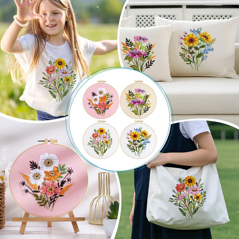 4-Piece Set: 4 material packs (embroidery fabric + coloured threads + needles) + embroidery hoop