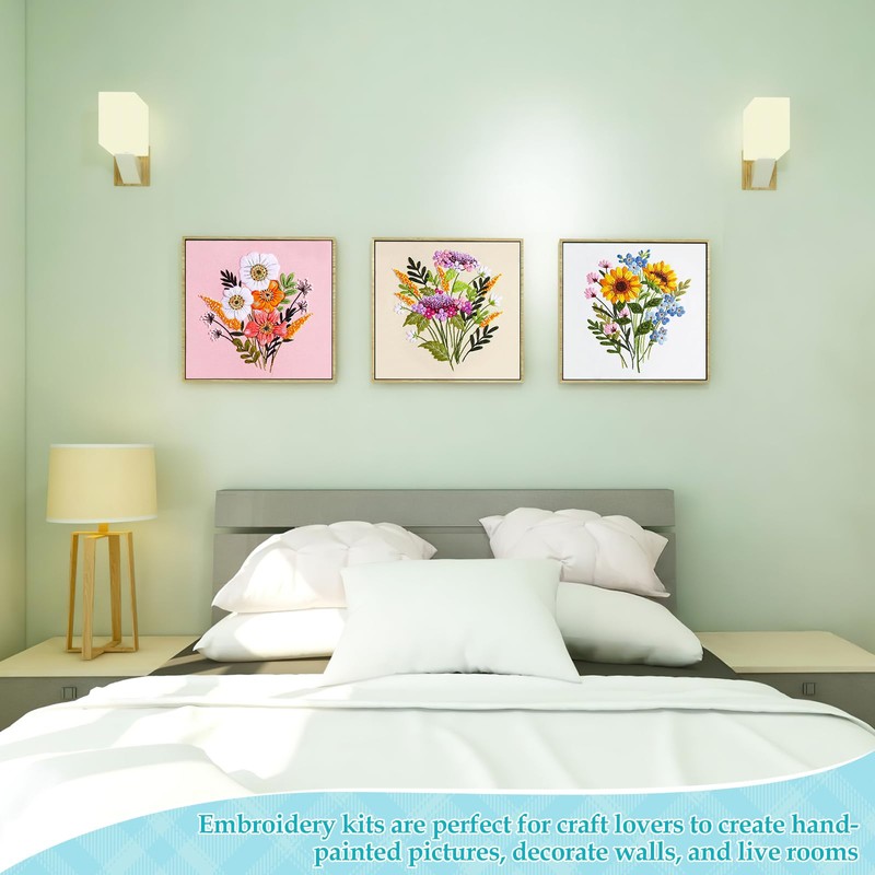 3-Piece Set: 3 material packs (embroidery fabric + coloured threads + needles) + embroidery hoop