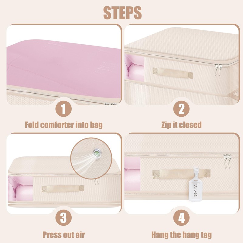 - Compresses to Just 7 Inches - This comforter storage bag features a space-saving compression design—after packing in bulky items like comforters or winter clothes, the bag compresses from 21.3 x 16.5 x 11.8 inches to just 7 inches thick! Like compression packing cubes, it's ideal for maximizing closet or under-bed storage.