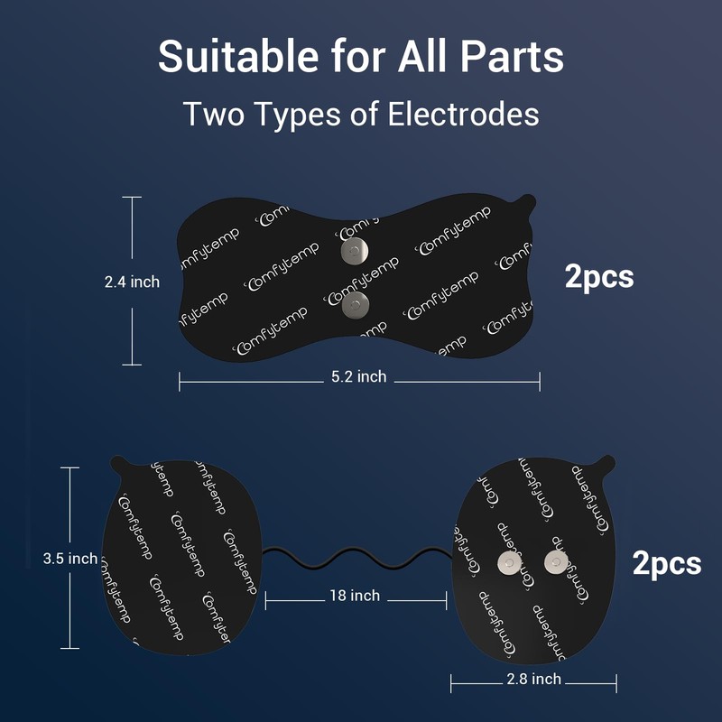- Individual Seal Package: Total 4 Pack, including 2 packs of 1-piece butterfly shape pad 5.2" x 2.4" and 2 packs of 2-piece line pad 3.5" x 2.8", each comes with an individual package. Sealed design for convenience of storage and use. Compatible with Comfytemp smart wireless TENS unit K6108(ASIN: B0CGHXNKDV).