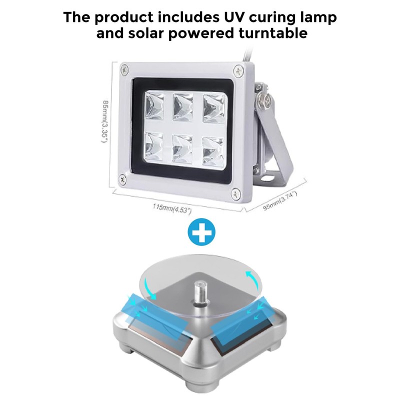 - The resin can be cured in 10-15 seconds from a distance of 5 cm from the light. NOTICE: thicker parts require more time to cure. What's more the dimension of the UV light is 3.35*4.53*3.74" and the turntable diameter is 3.5".