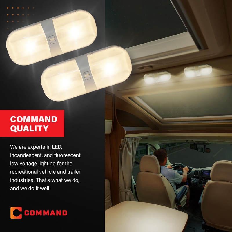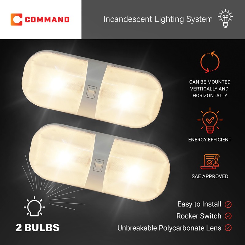 Command Electronics OEM 12V Incandescent RV Double Interior Dome Light with Rocker Switch – Made in USA – Surface Mount – 2-Pack, White. Part ID: MODEL #001-902
