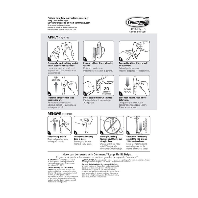 Command Metal Hooks are available in a variety of styles and finishes to match your decor. They also come in a variety of sizes and hold a surprising amount of weight up to five pounds! Forget about nails, screws and tacks, Command Metal Hooks are fast and easy to hang! Using the revolutionary Command Adhesive, Command Metal Hooks stick to many surfaces, including paint, wood, tile and more. Yet, they also come off leaving no holes, marks, sticky residue or stains so taking down or moving your Command Metal Hooks is simple and hassle free. And re hanging your hooks is as easy as applying a Command Refill Strip, so you can use them again and again!