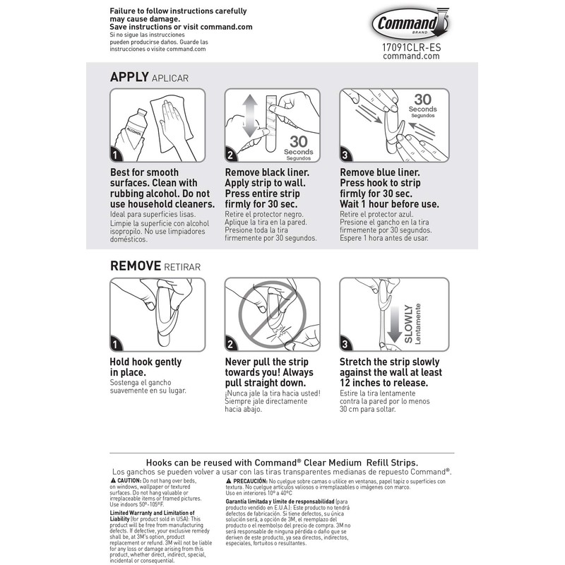* Available in a variety of shapes and sizes * Can be reused by applying a command clear refill strip * Easy to hang and easy to remove * Holds strongly, removes cleanly * Works on a variety of surfaces * Great for dorm, apartment, home and office