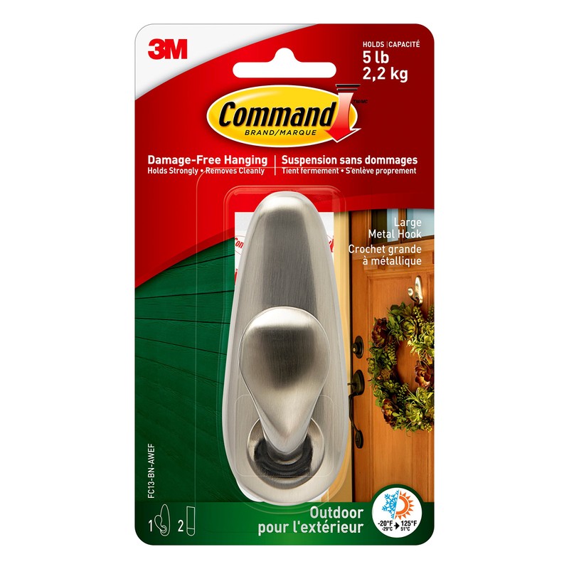 Command Outdoor Metal Hook, 1 Large Wall Hook 2 Water Resistant Strips