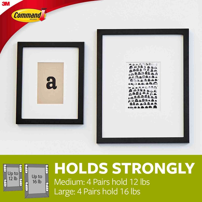 - INCLUDES- 8 Pairs of Medium, 8 Pairs of Large, Black Command Picture Hanging Strips (16 Strips total); 4 Medium Pairs hold 12 lbs. Maximum frame size of 18 inches x 24 inches, 4 Large Pairs hold 16 lbs. Maximum frame size of 24 inches x 36 inches