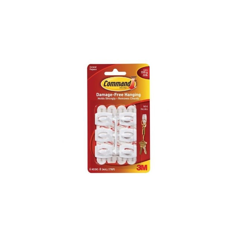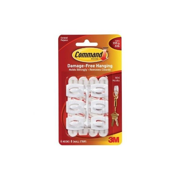 - Command Mini Hooks offer a mounting solution that holds firmly and removes cleanly. They leave no surface damage and are reusable. Ideal for organizing and decorating any office environment. Each hook holds up to 1/2 lb.