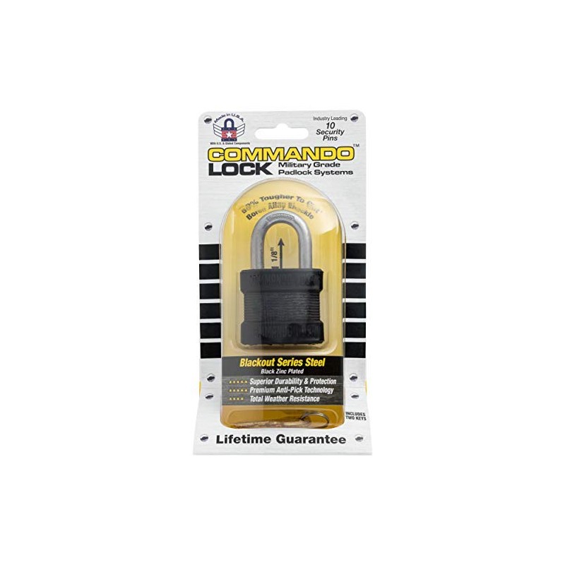 The Commando Lock Blackout 1300 Series locks feature our Solidbody Tek construction and a low profile black zinc coating: an interlocked and riveted body design that’s stronger than conventional locks. Compliant with US Military standards for safety and construction, these locks are ideal for all security uses. With a rust-resistant zinc coating and dual-hardened stainless steel, Blackout locks can handle much more than your average wear and tear. Chamfered rivet holes prevent the lock from fracturing when they're chiseled and our boron-alloy shackle is far more cut-resistant than your average steel. Additionally, the UV-resistant polypropylene bumpers will not scratch or mark your valuables. All Commando locks come with a pick and bump resistant security pin system that can feature up to 10 security pins, and Commando locks are key responsible - meaning the key stays in the lock until fully locked or open 180 degrees. Made in the USA with USA and global components.