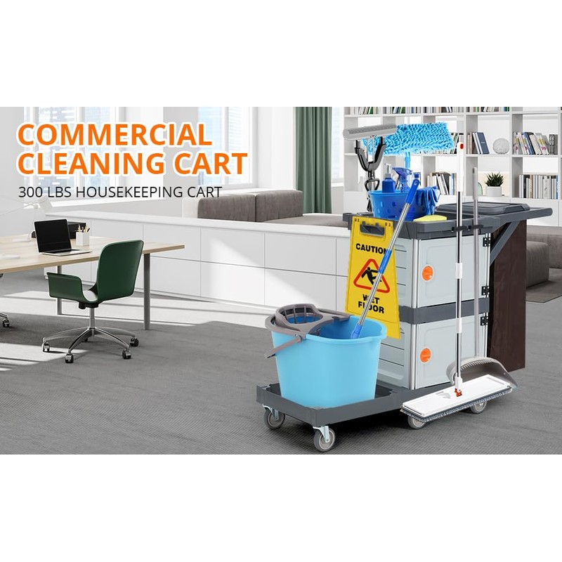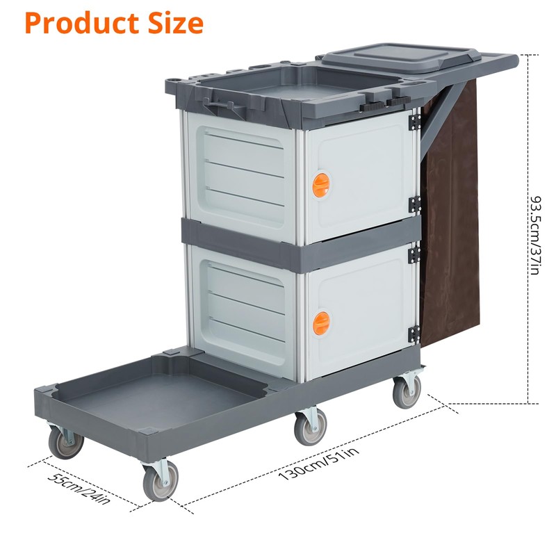 Commercial Janitorial Cart with 2 Cabinet - Black Housekeeping Caddy with Cover, Shelves, and Vinyl Bag