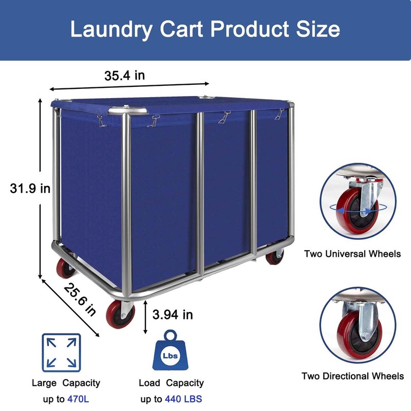 Commercial Laundry Cart with Wheels, 470L Industrial Rolling Laundry Basket, Large Heavy Duty Laundry Sorter with Watertight Oxford Bag & Sturdy Steel Frame for Home, Hotel, Hospital, 440 lbs (Blue)