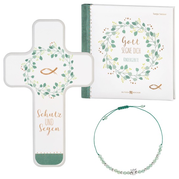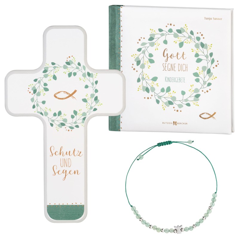 - The communion gift set consists of an elegant wooden cross, a children's prayer book and a bracelet, perfect for girls