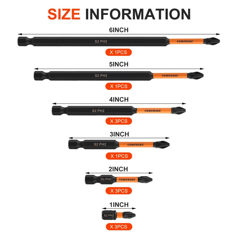 COMOWARE 12-Piece Magnetic Impact Phillips Bits Set, S2 Steel, #2 Phillips Head, 1/2/3/4/5/6 Inch Long, 1/4" Hex Shank Phillips Head Drill Bits Screwdriver Bits