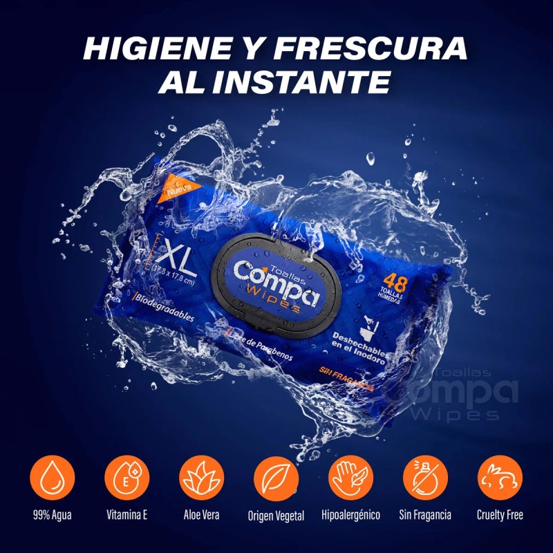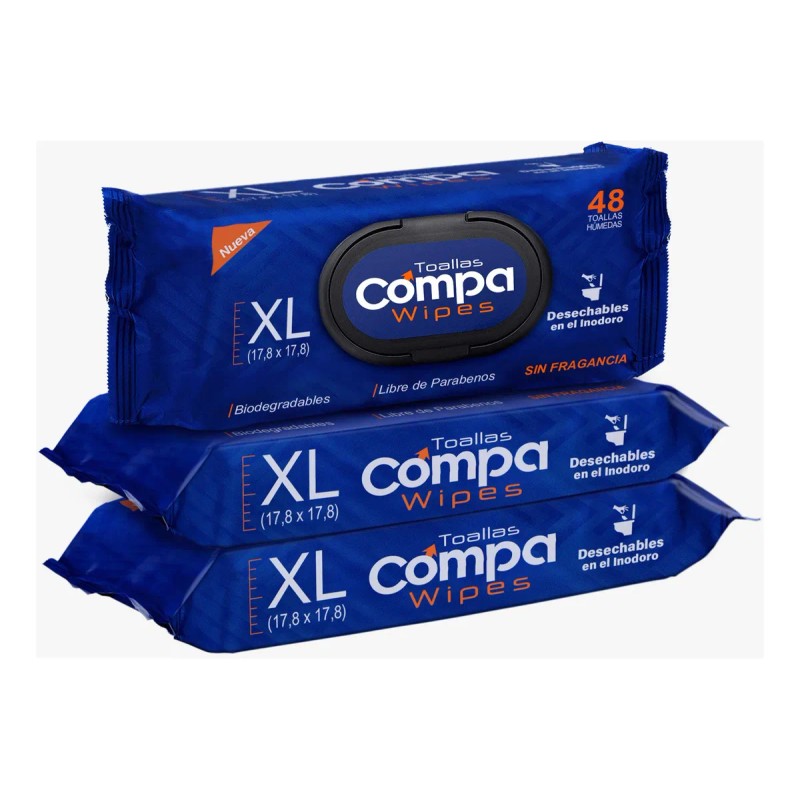 Compa Wipes presenta sus toallitas húmedas biodegradables sin fragancia, diseñadas para ofrecer una limpieza superior con suavidad, comodidad y practicidad en cada uso. Este paquete incluye tres packs individuales, cada uno con 48 toallitas de 7 x 7 pulgadas (17.78 cm), sumando un total de 144 unidades.