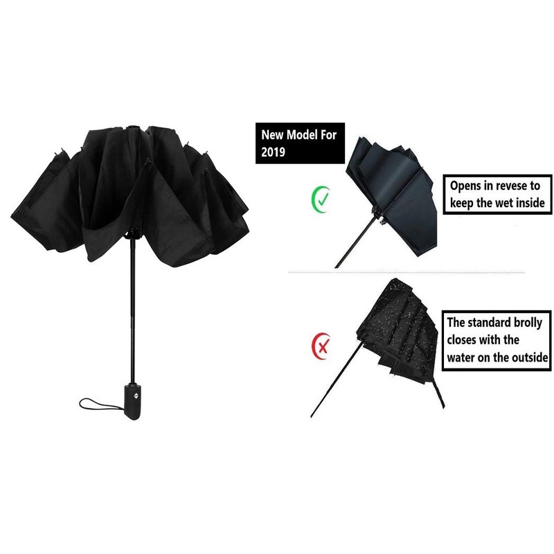 Compact Folding Reverse Umbrella Windproof Red Fibreglass Ribs Auto Open Close (Black)