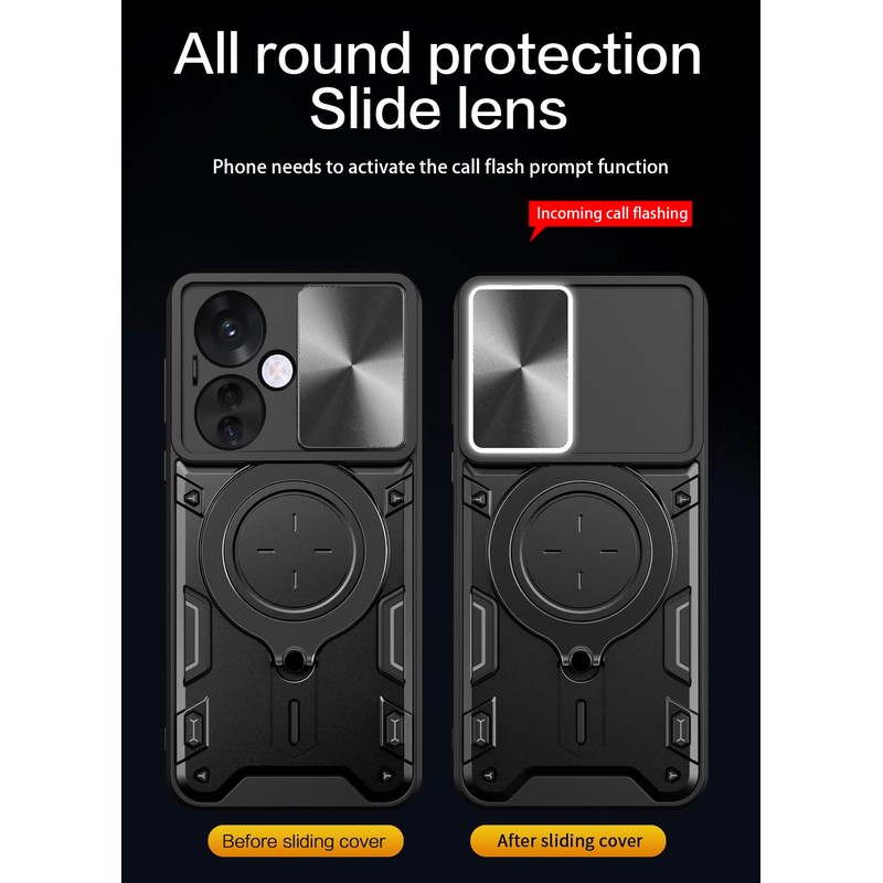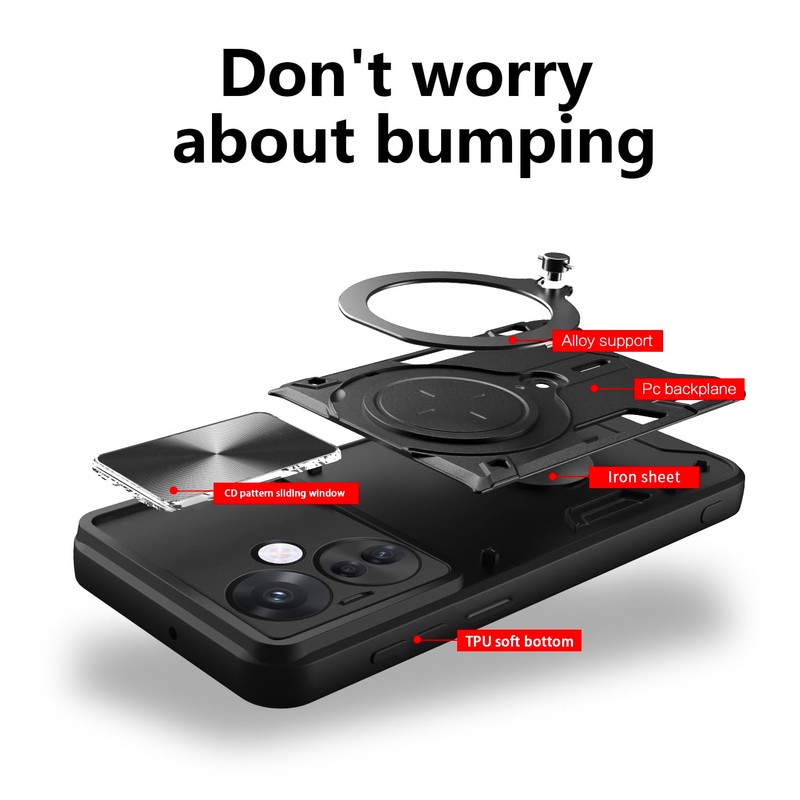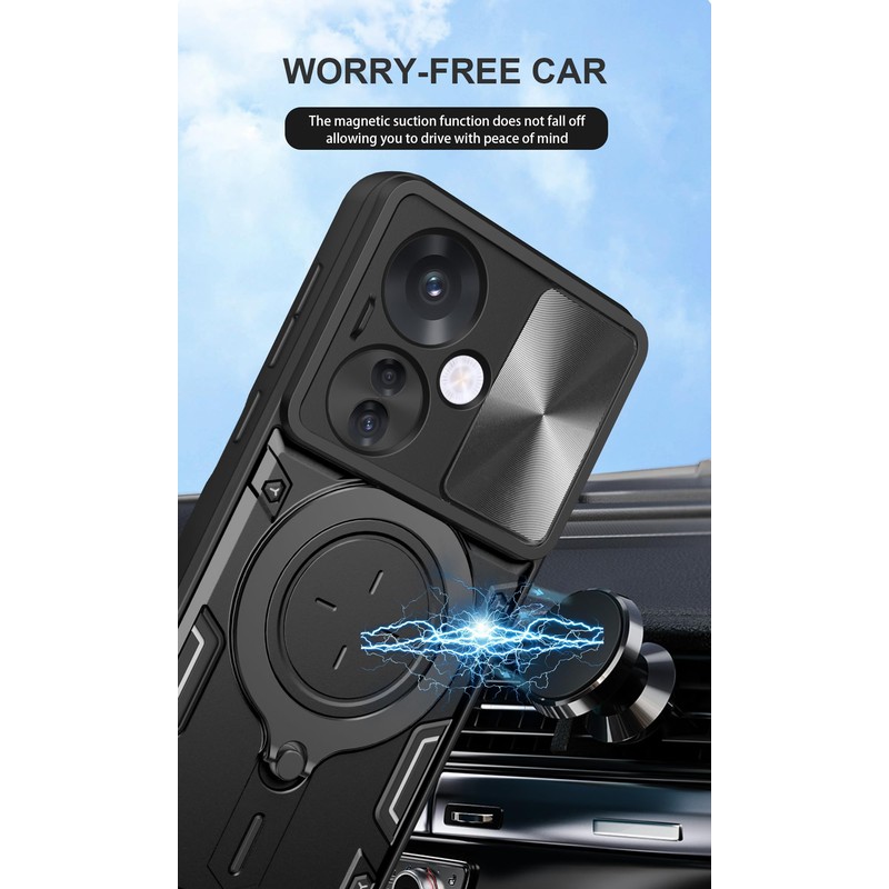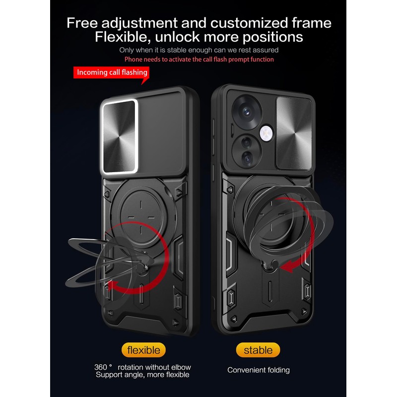 - Shockproof Phone Case with Sliding Camera Cover, Compatible with Oppo Reno11 F .The slidable camera cover has a slight lock on both sides and will not slide around. When you don't need to use the camera, simply slide it open and closed to protect your phone's camera from scratches and breakage. Built-in convenient slidable camera lens cover not only protects your phone camera from scratches 360 degrees, but also keeps your phone camera clean.